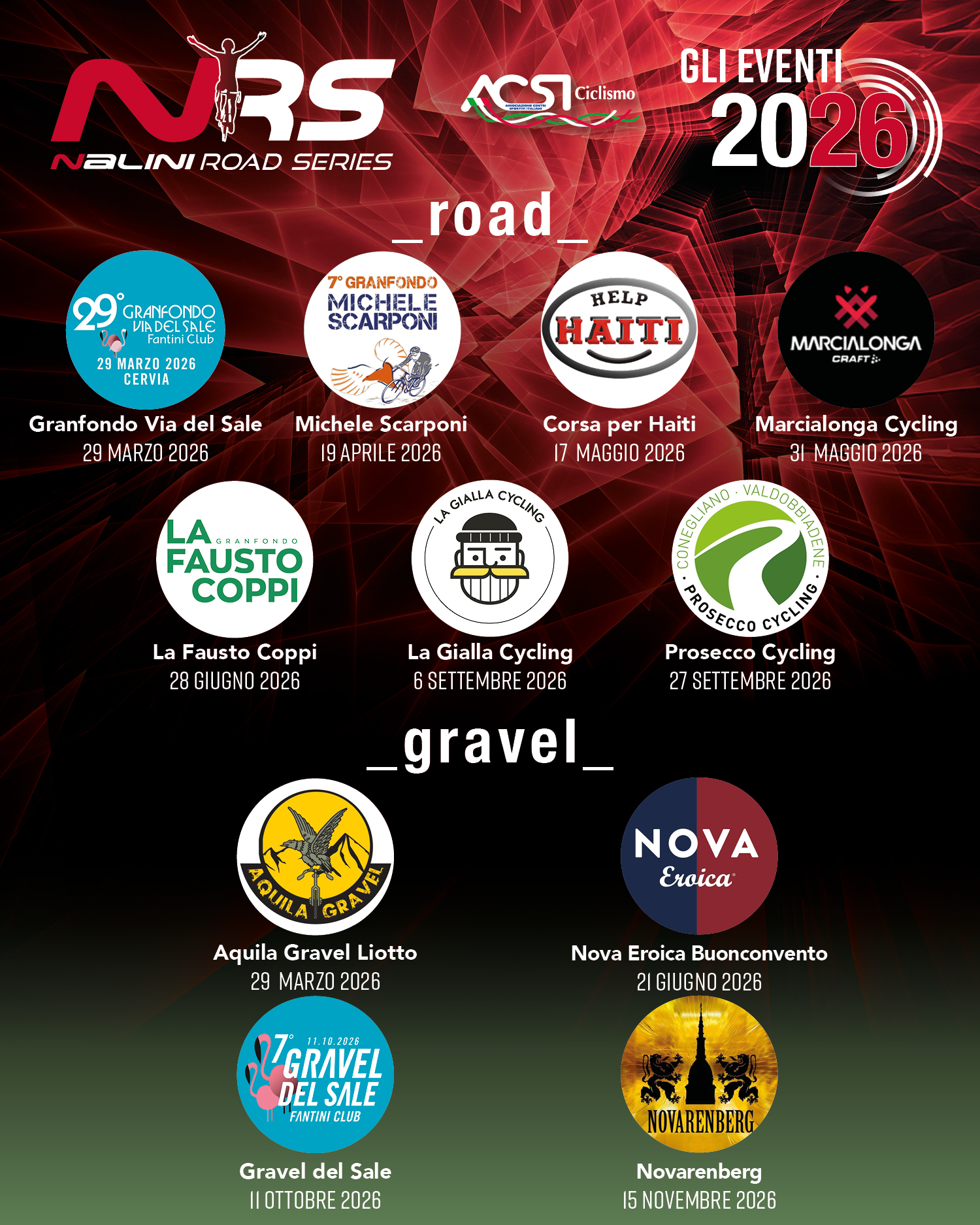 Dai professionisti agli amatori, trasferendo tutta l’esperienza, la passione e il knowhow costruiti negli anni nasce Nalini Road Series, un circuito, organizzato sotto l’egida di ACSI, che racchiude nella sua compagine undici fra le manifestazioni più partecipate ed apprezzate a livello nazionale nel settore del ciclismo amatoriale.